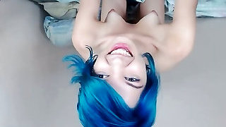 Blue haired hot bi-atch gets banged hard in her twat on sofa