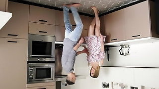 Hot babe in erotic stockings is blowing and riding a rock hard penis in the kitchen