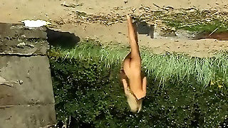 Dark haired nudist spied pissing on the beachvoyeur voyeur