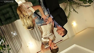 Clothed glamour pornstars blow one dick and take turns riding it
