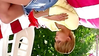 Gorgeous and busty blondie drains while watching another blonde in solo action