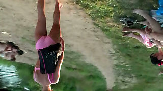Risky public drill with Russian brunette in leggings