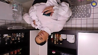 Humungous mature with big tits and perky nipples is masturbating in the kitchen and moaning while jizzing